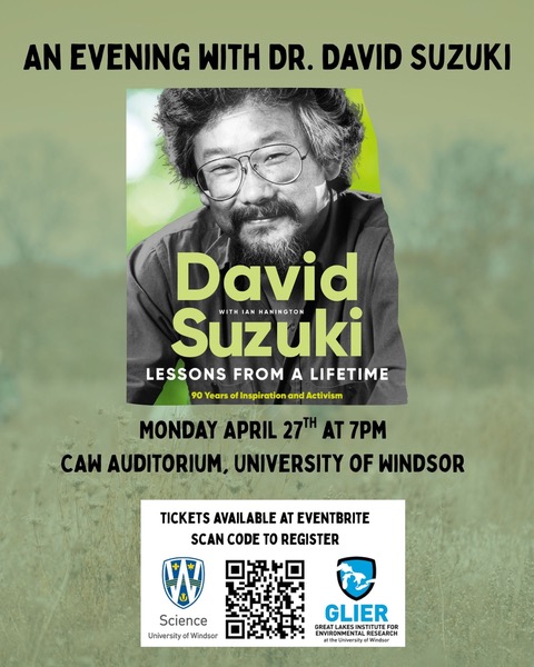 Come and enjoy a presentation by David Suzuki describing his most recent book Lessons from A Lifetime: 90 Years of Inspiration and Activism. He will be presenting on April 27, 2026 at 7:00 pm at the Alumni Auditorium, CAW Student Centre at the University of Windsor.